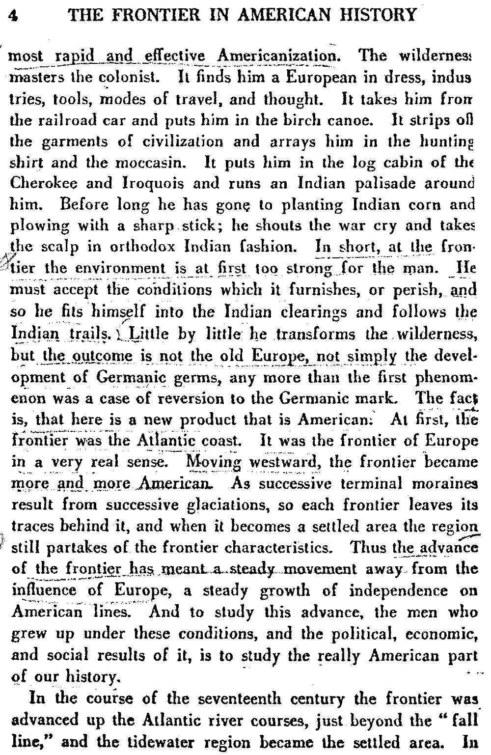 In the settlement of America we have to observe how European life entered the continent, and how America modified and developed that life and reacted on Europe. Our early history is the study of European germs developing in an American environment. Too exclusive attention has been paid by institutional students to the Germanic origins, too little to the American factors. The frontier is the line of [4]most rapid and effective Americanization. The wilderness masters the colonist. It finds him a European in dress, industries, tools, modes of travel, and thought. It takes him from the railroad car and puts him in the birch canoe. It strips off the garments of civilization and arrays him in the hunting shirt and the moccasin. It puts him in the log cabin of the Cherokee and Iroquois and runs an Indian palisade around him. Before long he has gone to planting Indian corn and plowing with a sharp stick; he shouts the war cry and takes the scalp in orthodox Indian fashion. In short, at the frontier the environment is at first too strong for the man. He must accept the conditions which it furnishes, or perish, and so he fits himself into the Indian clearings and follows the Indian trails. Little by little he transforms the wilderness, but the outcome is not the old Europe, not simply the development of Germanic germs, any more than the first phenomenon was a case of reversion to the Germanic mark. The fact is, that here is a new product that is American. At first, the frontier was the Atlantic coast. It was the frontier of Europe in a very real sense. Moving westward, the frontier became more and more American. As successive terminal moraines result from successive glaciations, so each frontier leaves its traces behind it, and when it becomes a settled area the region still partakes of the frontier characteristics. Thus the advance of the frontier has meant a steady movement away from the influence of Europe, a steady growth of independence on American lines. And to study this advance, the men who grew up under these conditions, and the political, economic, and social results of it, is to study the really American part of our history.