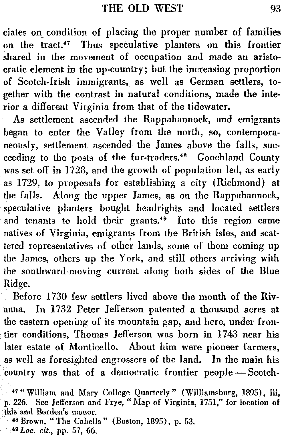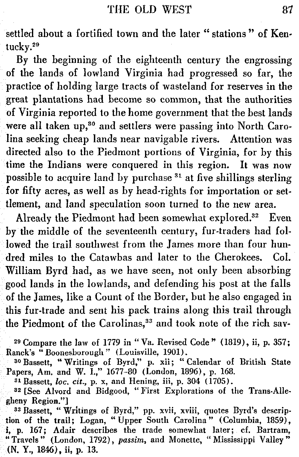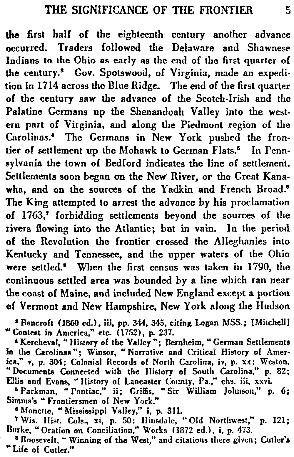 In the course of the seventeenth century the frontier was advanced up the Atlantic river courses, just beyond the "fall line," and the tidewater region became the settled area. In [5]the first half of the eighteenth century another advance occurred. Traders followed the Delaware and Shawnese Indians to the Ohio as early as the end of the first quarter of the century.[5:1] Gov. Spotswood, of Virginia, made an expedition in 1714 across the Blue Ridge. The end of the first quarter of the century saw the advance of the Scotch-Irish and the Palatine Germans up the Shenandoah Valley into the western part of Virginia, and along the Piedmont region of the Carolinas.[5:2] The Germans in New York pushed the frontier of settlement up the Mohawk to German Flats.[5:3] In Pennsylvania the town of Bedford indicates the line of settlement. Settlements soon began on the New River, or the Great Kanawha, and on the sources of the Yadkin and French Broad.[5:4] The King attempted to arrest the advance by his proclamation of 1763,[5:5] forbidding settlements beyond the sources of the rivers flowing into the Atlantic; but in vain. In the period of the Revolution the frontier crossed the Alleghanies into Kentucky and Tennessee, and the upper waters of the Ohio were settled.[5:6] When the first census was taken in 1790, the continuous settled area was bounded by a line which ran near the coast of Maine, and included New England except a portion of Vermont and New Hampshire, New York along the Hudson [6]and up the Mohawk about Schenectady, eastern and southern Pennsylvania, Virginia well across the Shenandoah Valley, and the Carolinas and eastern Georgia.[6:1] Beyond this region of continuous settlement were the small settled areas of Kentucky and Tennessee, and the Ohio, with the mountains intervening between them and the Atlantic area, thus giving a new and important character to the frontier. The isolation of the region increased its peculiarly American tendencies, and the need of transportation facilities to connect it with the East called out important schemes of internal improvement, which will be noted farther on. The "West," as a self-conscious section, began to evolve.