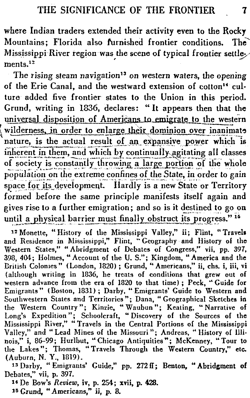 The rising steam navigation[7:2] on western waters, the opening of the Erie Canal, and the westward extension of cotton[7:3] culture added five frontier states to the Union in this period. Grund, writing in 1836, declares: "It appears then that the universal disposition of Americans to emigrate to the western wilderness, in order to enlarge their dominion over inanimate nature, is the actual result of an expansive power which is inherent in them, and which by continually agitating all classes of society is constantly throwing a large portion of the whole population on the extreme confines of the State, in order to gain space for its development. Hardly is a new State or Territory formed before the same principle manifests itself again and gives rise to a further emigration; and so is it destined to go on until a physical barrier must finally obstruct its progress."[7:4]
