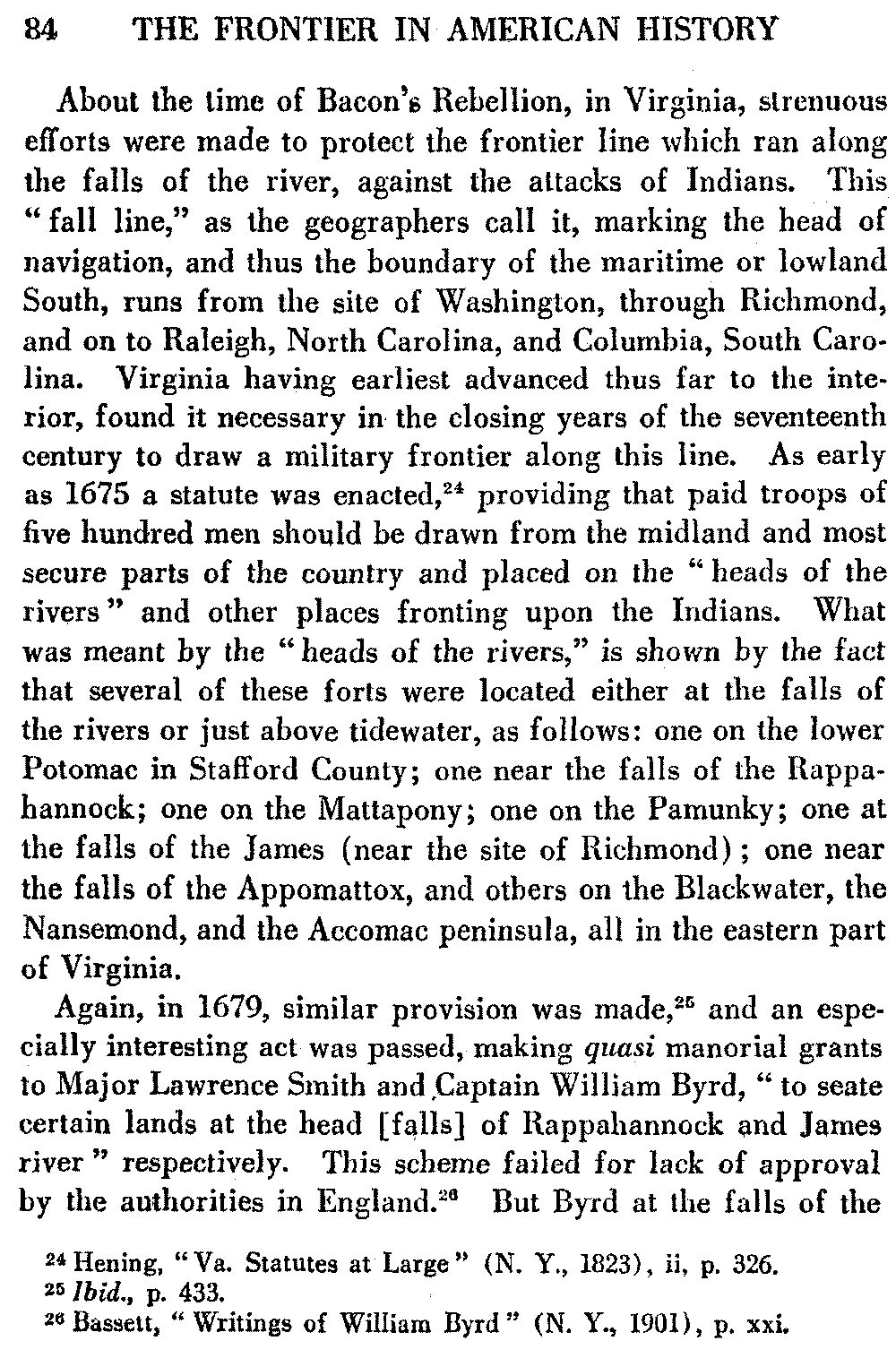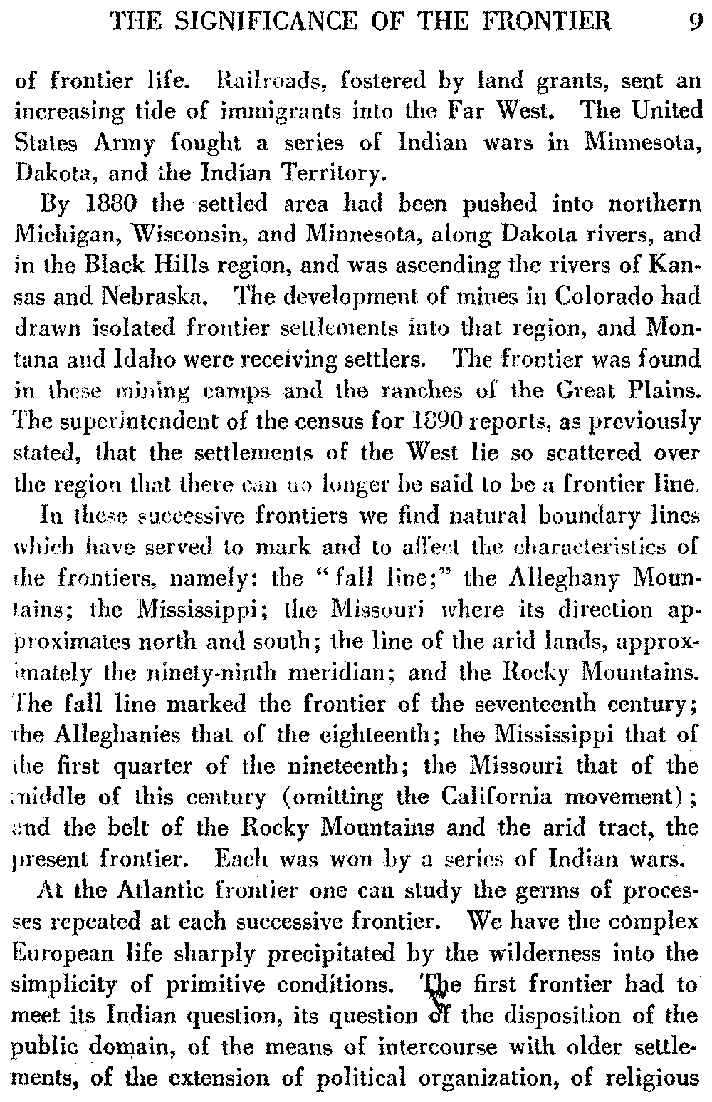 In these successive frontiers we find natural boundary lines which have served to mark and to affect the characteristics of the frontiers, namely: the "fall line;" the Alleghany Mountains; the Mississippi; the Missouri where its direction approximates north and south; the line of the arid lands, approximately the ninety-ninth meridian; and the Rocky Mountains. The fall line marked the frontier of the seventeenth century; the Alleghanies that of the eighteenth; the Mississippi that of the first quarter of the nineteenth; the Missouri that of the middle of this century (omitting the California movement); and the belt of the Rocky Mountains and the arid tract, the present frontier. Each was won by a series of Indian wars.