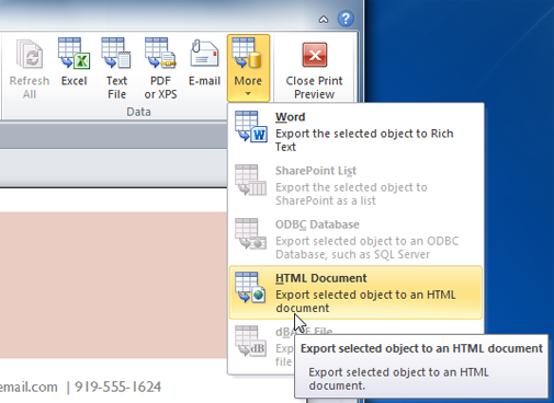 The Print commandYou can save reports in other formats so they will be viewable outside of Access. This is called exporting a file, and it allows you to view and even modify reports in other formats and programs.