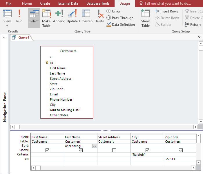 Setting the search criteria so that the query will find records with either "Raleigh" in the City field or "27513" in the Zip Code field. - After you have set your criteria, run the query by clicking the Run command on the Design tab.