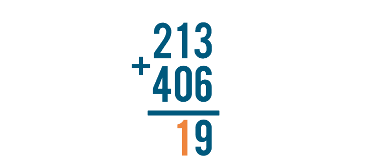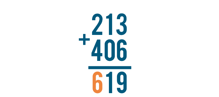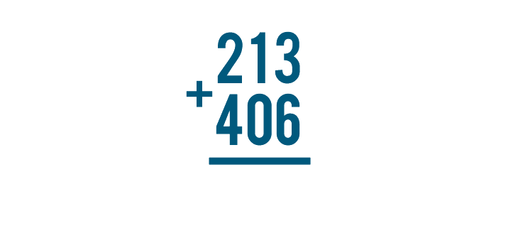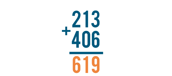 The problem is complete. Our total is 619, or six hundred nineteen. 213 + 406 = 619.