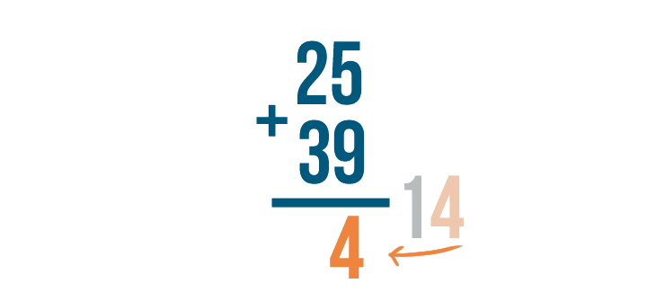Our first step is to add the digits on the right— 5 and 9. However, you might notice there isn't room to write the sum, 14. When the sum of two digits in a math problem is greater than 9, the normal way of adding stacked numbers won't work. You'll have to use a technique called carrying.