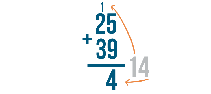 Do you see what we did? Our sum was 14. We put the 4 underneath the line, and carried the 1 and placed it above the next set of digits.