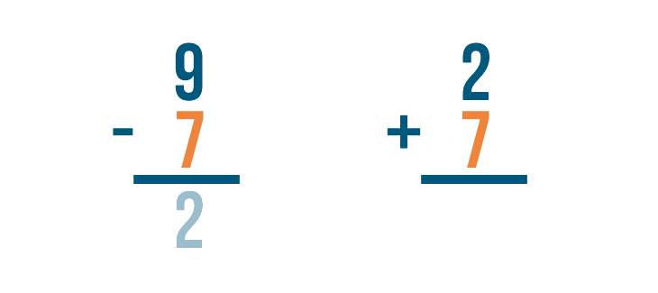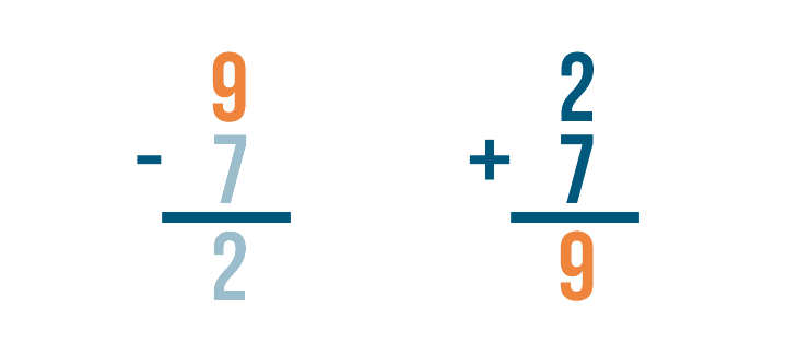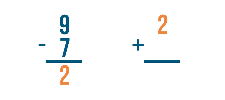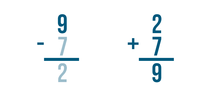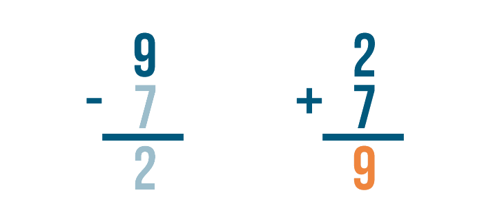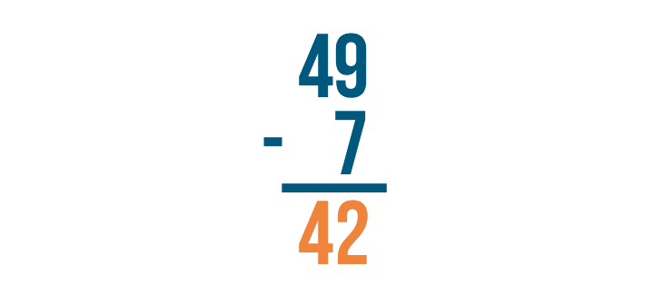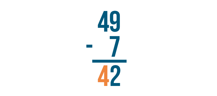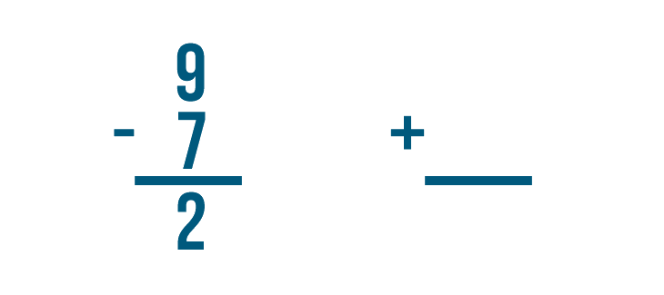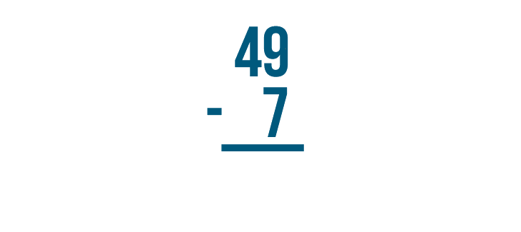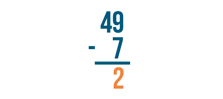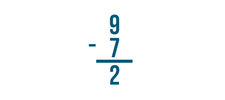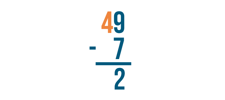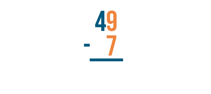 With all stacked subtraction problems, we start with the digits that are farthest to the right. Here, we'll begin with 9 and 7.
