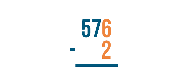 Here's another problem, 576 - 2. With this problem, see how we lined up the numbers to the right?