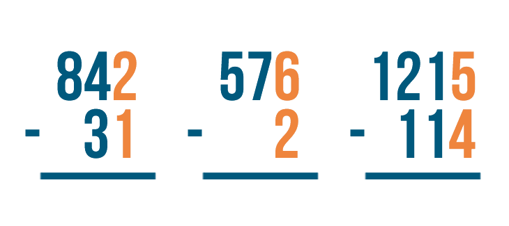 In the slideshow, you saw that stacked subtraction problems are always solved from right to left. The expressions below are solved the same way. First, the bottom right digit is subtracted from the top right digit. Then, the bottom left digit is subtracted from the top left digit.