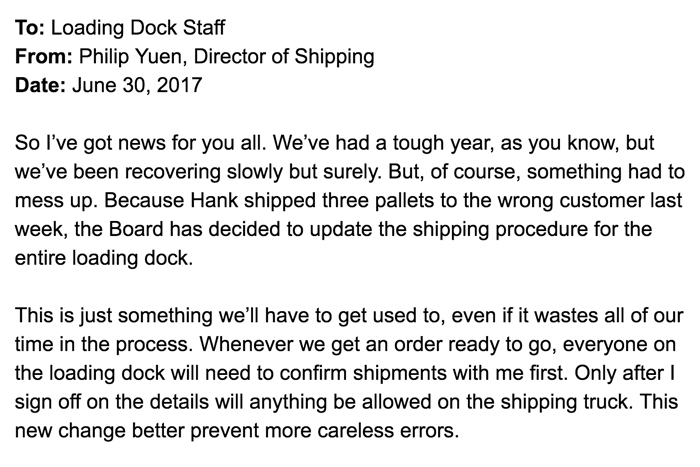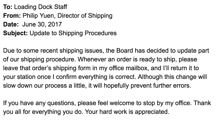 Let’s explore a few business memos to see this lesson in action. We'll start with an example of a poorly written memo.