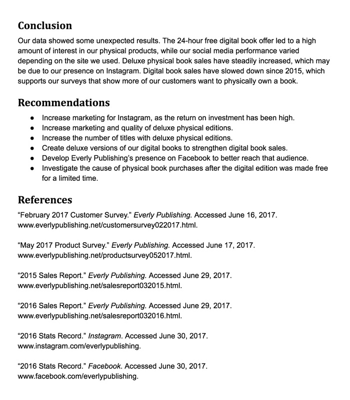 The conclusion features a little of the writer's opinion on the key findings, although the writing is still centered around the company's perspective. The recommendations are clear and supported by the data, while the references are thorough.