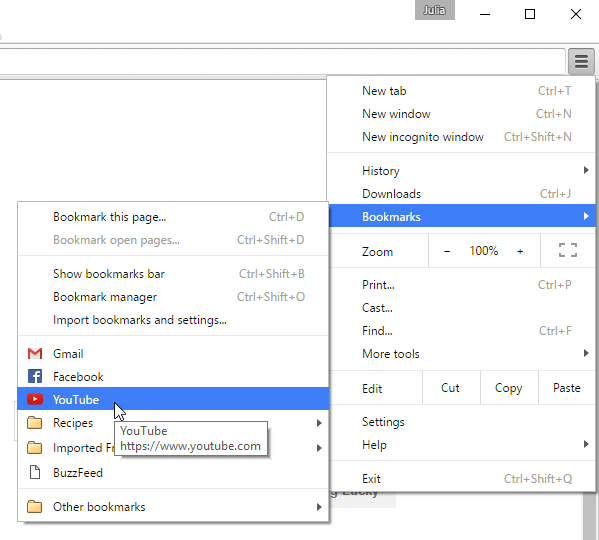 - The Chrome menu: Click the Chrome menu in the top-right corner, hover over Bookmarks, then click the bookmark you'd like to open.