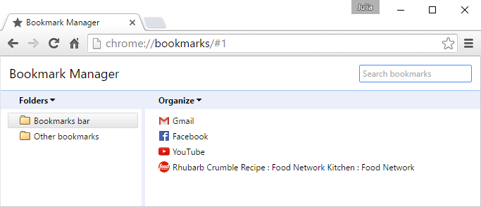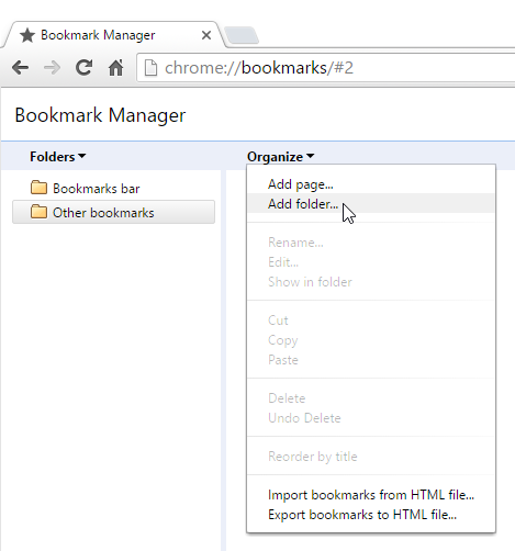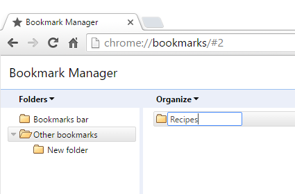If you have different bookmarks on one topic, you might consider creating a folder to keep them organized. New folders can be added either to the Bookmarks bar folder or the Other bookmarks folder.