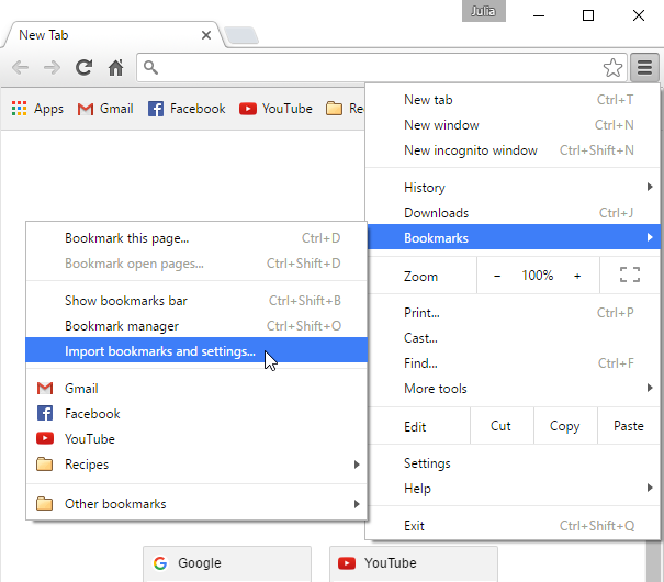 - Click the Chrome menu in the top-right corner of the browser, hover the mouse over Bookmarks, then select Import bookmarks and settings...