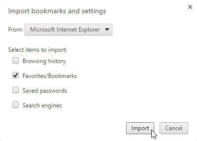 - A dialog box will appear. Select the browser and the items to be imported. In this example, we'll import bookmarks from Internet Explorer.