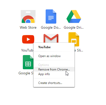 If you want to delete an app, right-click the icon, then select Remove from Chrome from the drop-down menu. You can also delete an app by clicking and dragging the icon to the trash can in the lower-right corner.