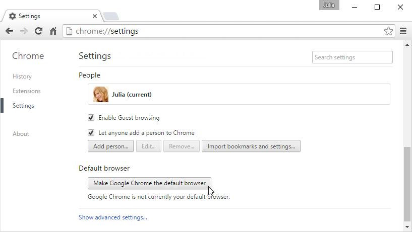 The Settings tab will appear. Scroll down and select Make Google Chrome the default browser. Any link you open on your computer will now open in Google Chrome.