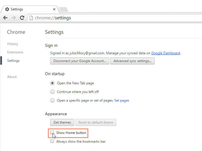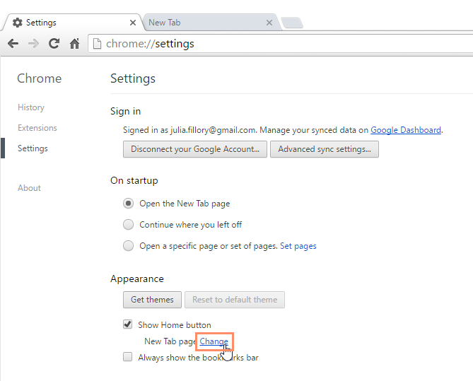 By default, Chrome will open the New Tab page whenever you click the Home button. To choose a new homepage, click Change.