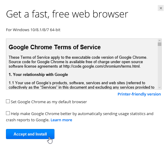 - A dialog box will appear. Review the Google Chrome Terms of Service, then click Accept and Install.