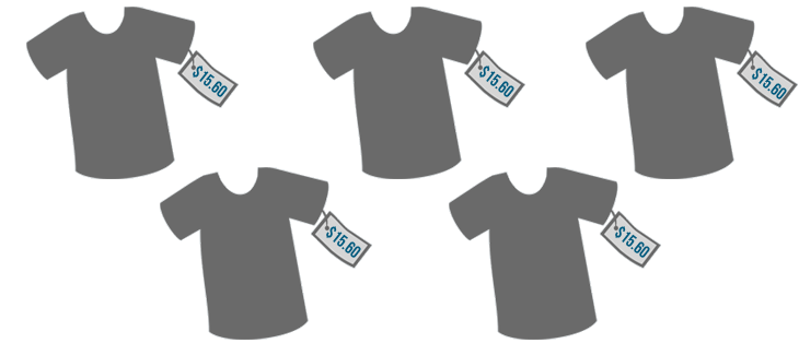 Adding this many numbers could take a long time. In the lesson on multiplication, we learned that when you multiply, you are increasing a number many times. Because all of the shirt prices are the same, multiplication could help you solve this problem a little faster.