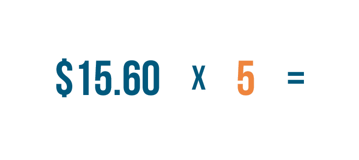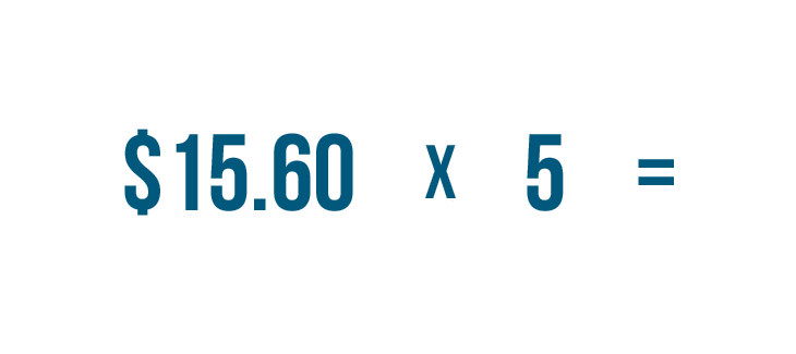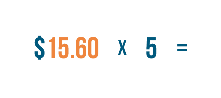 Instead of adding $15.60 + $15.60 + $15.60 + $15.60 + $15.60...we'll multiply $15.60 by 5.