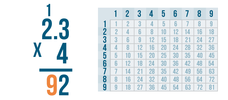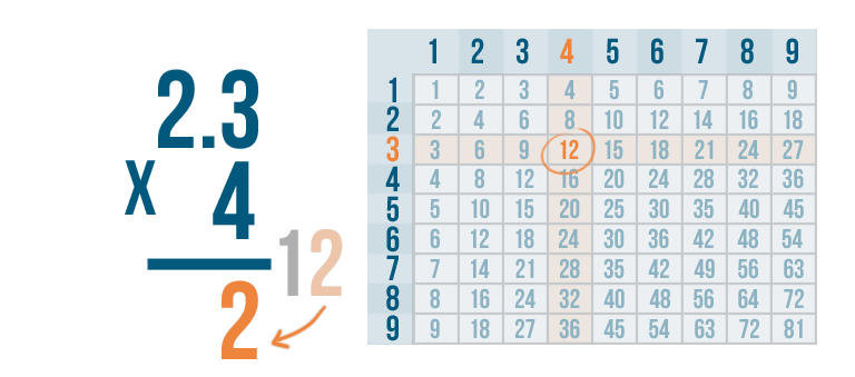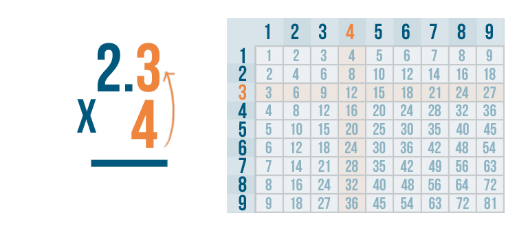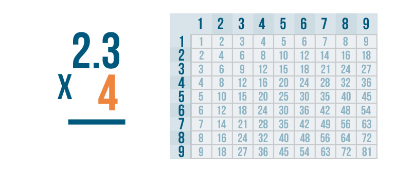 We'll multiply 4 by the top number, 2.3. Since there's no 2.3 in the times table, we'll have to multiply one digit at a time.