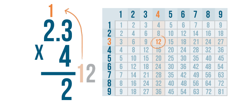 4 x 3 is 12, but there's no room to write both digits underneath the 4 and 3.
