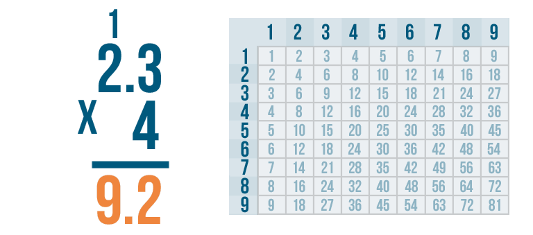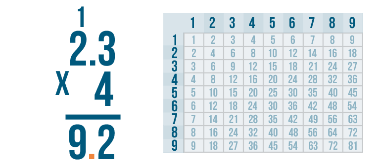 Multiplying decimal numbers is a lot like multiplying larger numbers. If you divide the large problem into a few smaller ones, it will be easier to solve. Let's see how this works by solving this problem: 2.3 x 4.