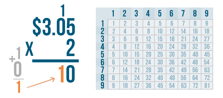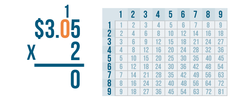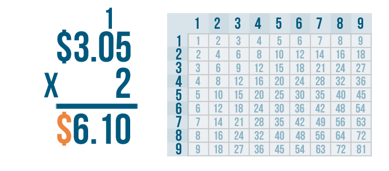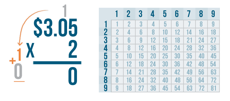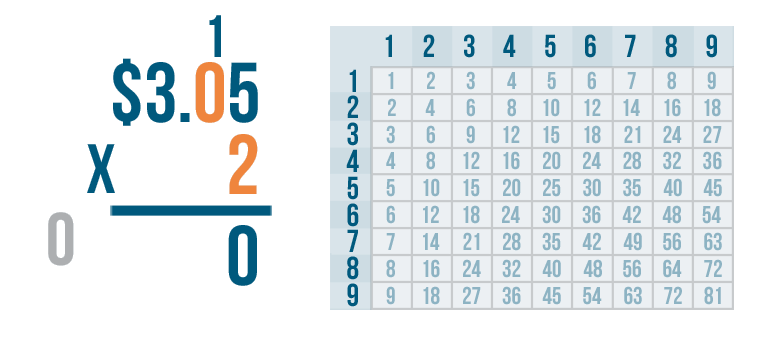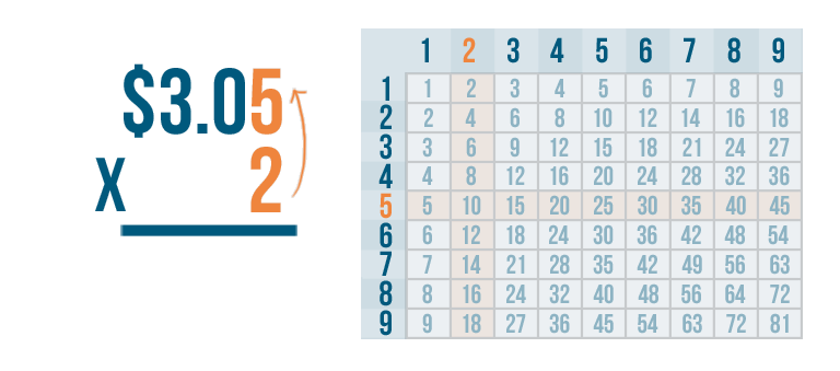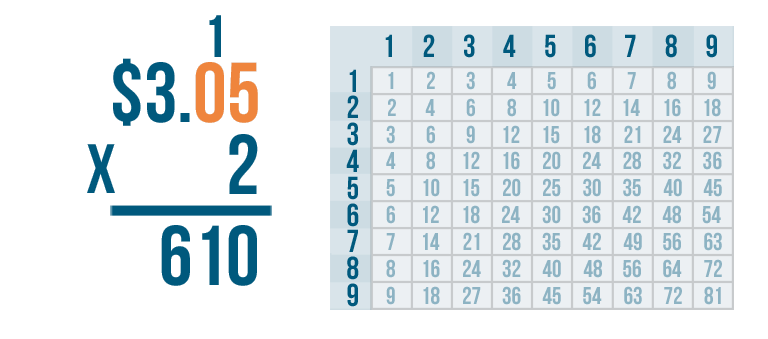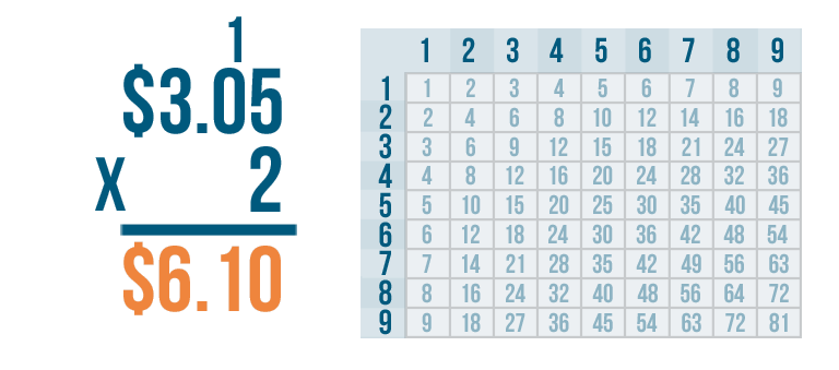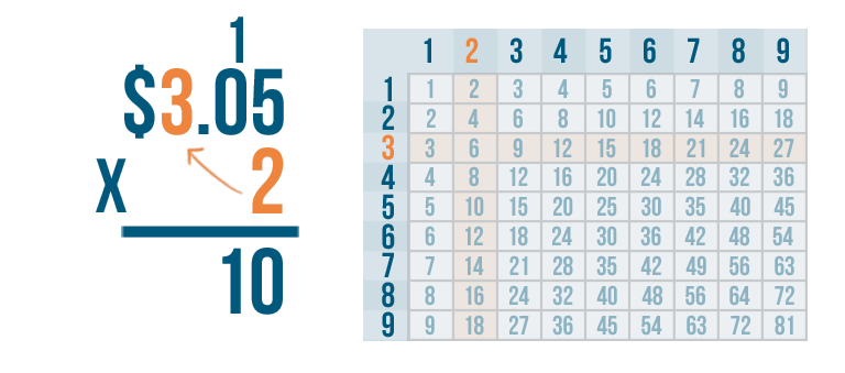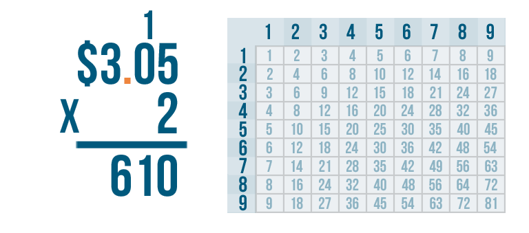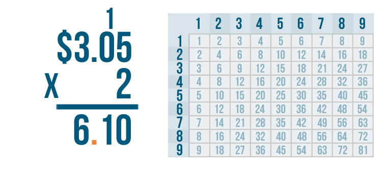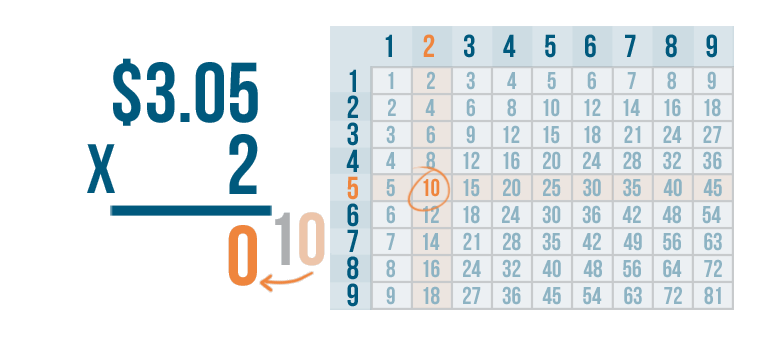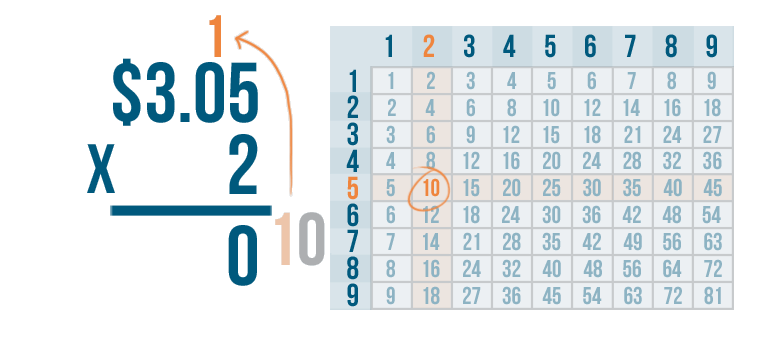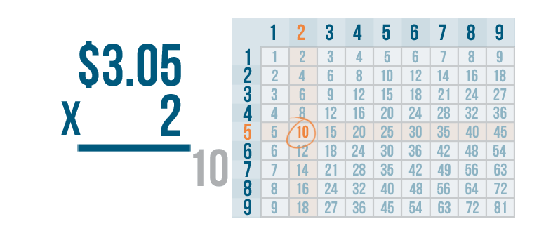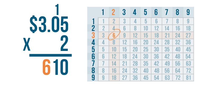 Let's try another problem. This time we'll multiply money: $3.05 x 2.