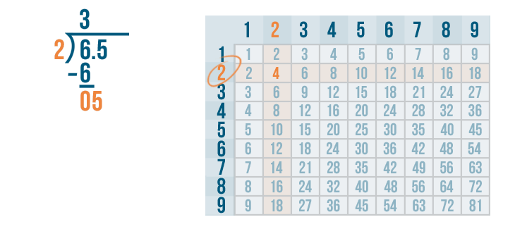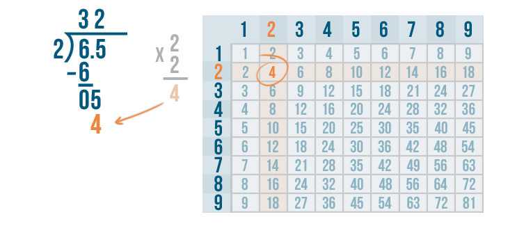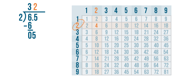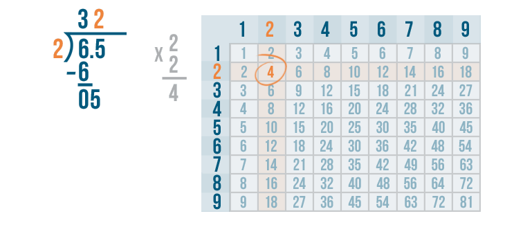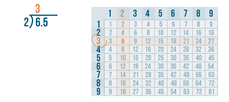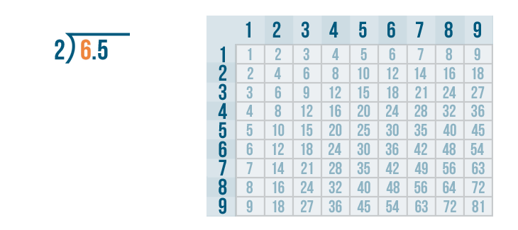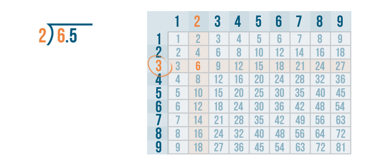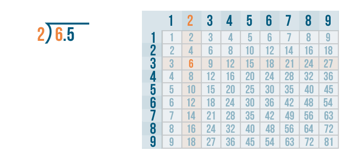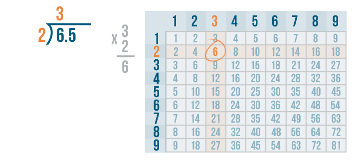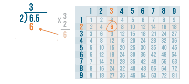 We'll use the times table to help us. Remember, if you need to review how to use the times table, you can revisit the lesson on multiplication. Now it's time to solve 6 / 2.