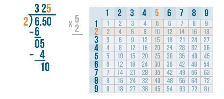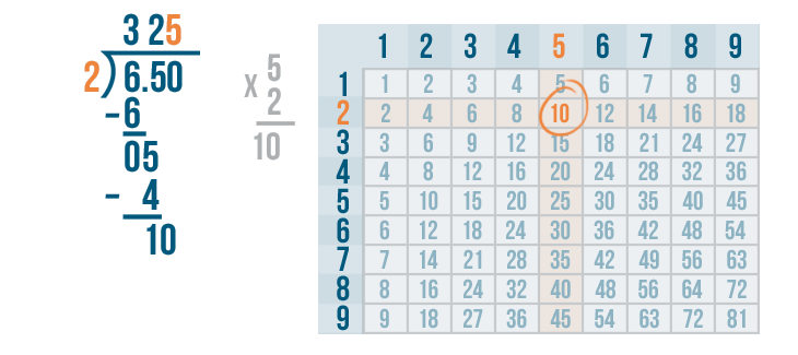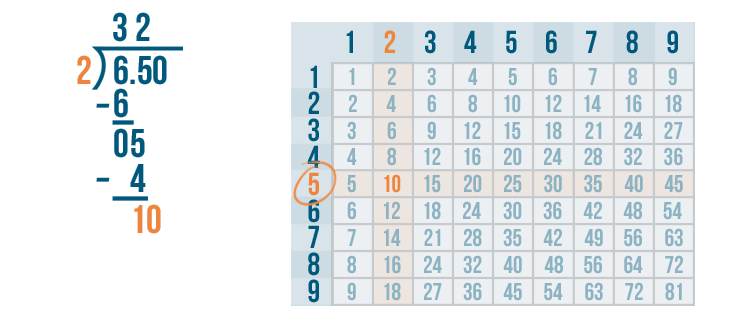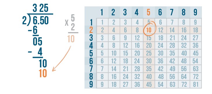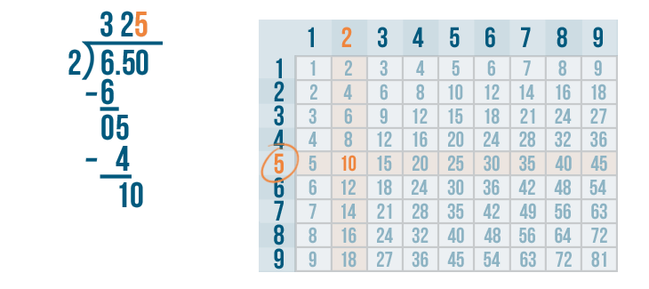 10 is located in the 5's row. This means 2 goes into 10 five times.