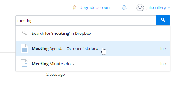 Searching lets you look for specific files using words contained within the file or file name. To do this, locate the search bar, then enter the word or file name you're looking for. A list of files will appear as you type. Simply click a file to open it directly from the search results. You can also press the Enter key to see a full list of search results.