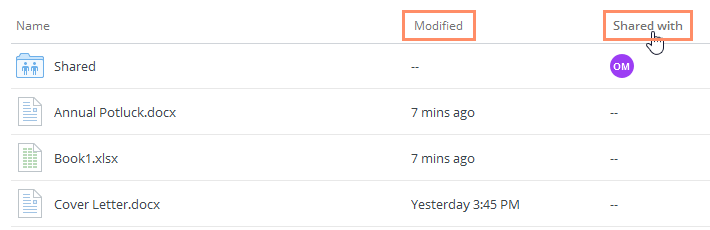 By default, your files are already sorted in alphabetical order. However, you can apply different sorts to put your files in a different order. You can click the Modified header above your files to sort them by the date they were modified. Additionally, you can click the Shared with header to cycle through various other sorts, including Kind, Extension, and Size.