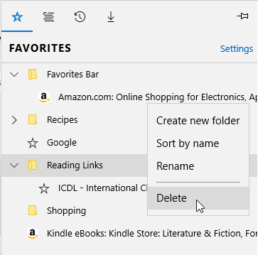 - From the Favorites tab in the Hub, locate the favorite or folder you want to delete, then right-click and select Delete.