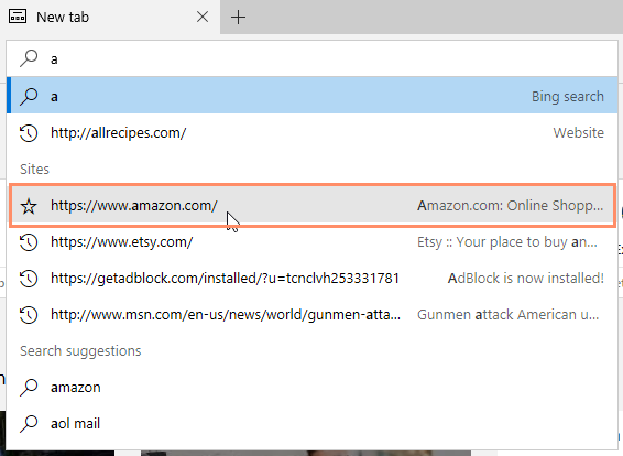 - The address bar: As you begin typing in the address bar, any favorites matching the text will appear with a star next to them. Click a favorite to open it.