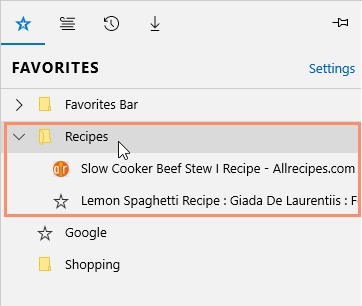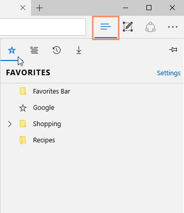 - The Hub: Click the Hub button, then select the Favorites tab to see your favorites.