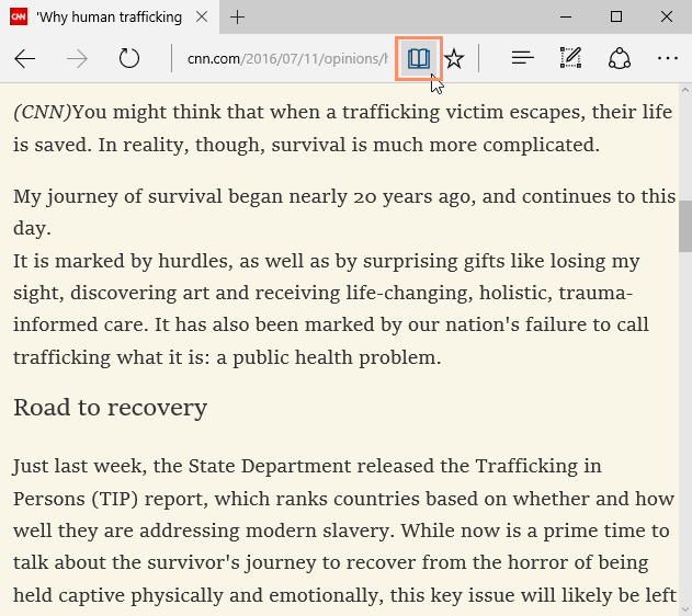 Edge offers a feature called Reading view that makes reading a variety of articles and websites easier. When you use Reading view, all of the ads, banners, and navigation buttons are removed, leaving you with just the text and pictures from that article. This provides the reader with a more streamlined reading experience with fewer distractions and more of a minimalistic look. To use Reading view, simply click the book symbol next to the address bar.