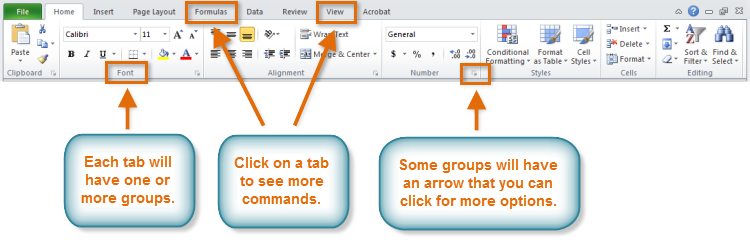 The Ribbon contains all of the commands you will need in order to perform common tasks. It has multiple tabs, each with several groups of commands, and you can add your own tabs that contain your favorite commands. Some groups have an arrow in the bottom-right corner that you can click to see even more options.
