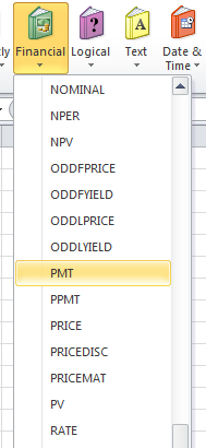 The Financial category contains functions for financial calculations like determining a payment (PMT) or interest rate for a loan (RATE).