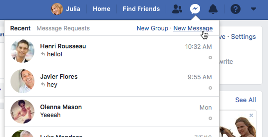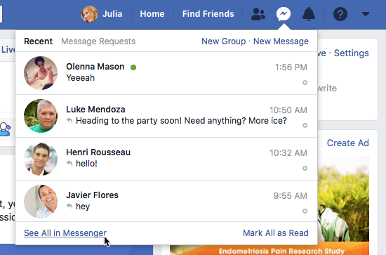 To access your inbox, click the Messages icon, then select See All in Messenger. The Messenger will appear.
