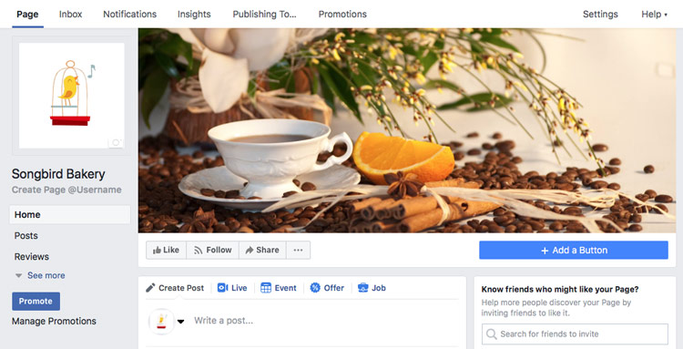 - The Facebook page will appear. From here, you can customize your page, invite people to like the page, create posts, and more.