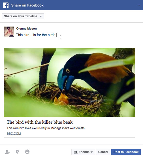 Facebook makes it easy reshare the things your friends post. Just click Share at the bottom of a post to share it with your other friends.