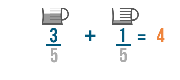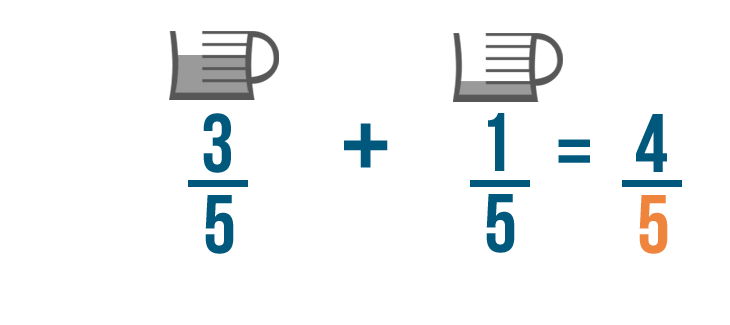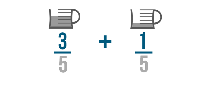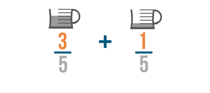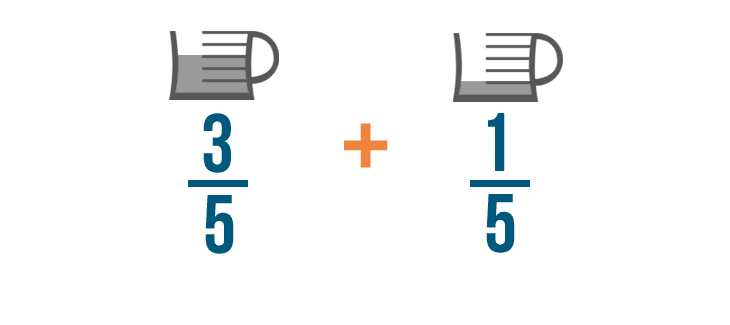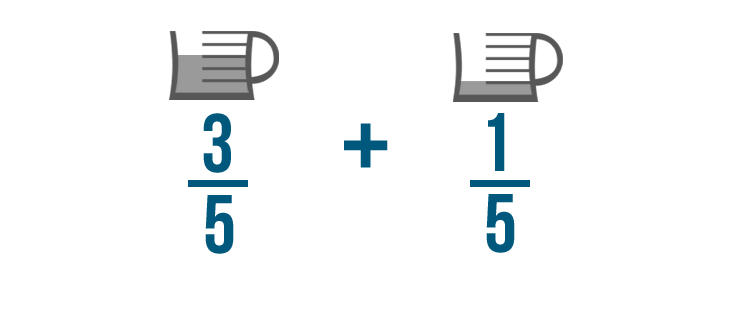 Let's continue with our previous example and add these fractions: 3/5 of cup of oil and 1/5 of a cup of oil.