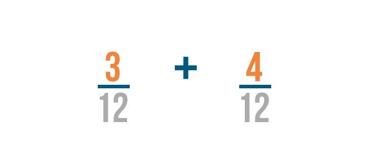 3 plus 4 equals 7. As usual, the denominator stays the same. So 3/12 plus 4/12 equals 7/12.
