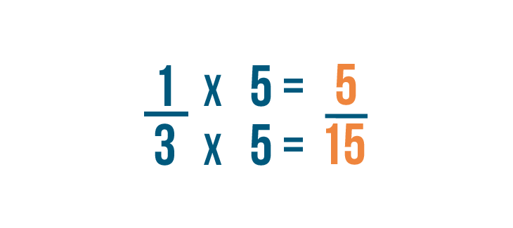 Now let's change the second fraction. To change the denominator to 15, we'll multiply both numbers by 5 to get 5/15.