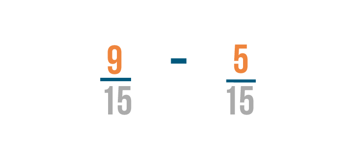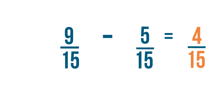 9 minus 5 equals 4. As always, the denominator stays the same. So 9/15 minus 5/15 equals 4/15.