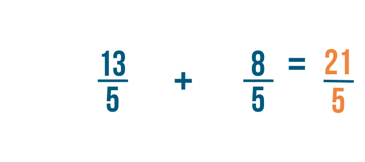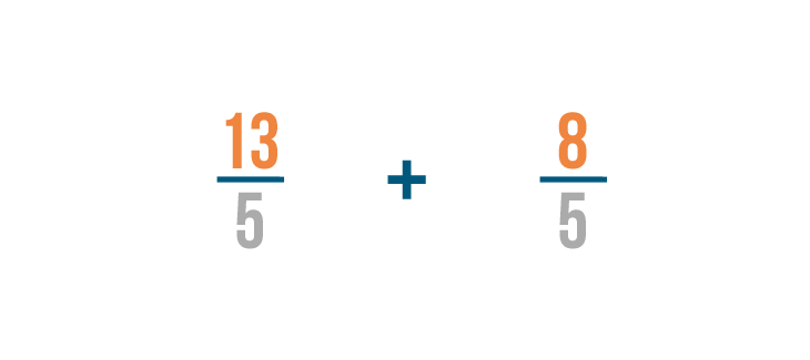 13 plus 8 equals 21. As usual, the denominator will stay the same. So 13/5 + 8/5 = 21/5.