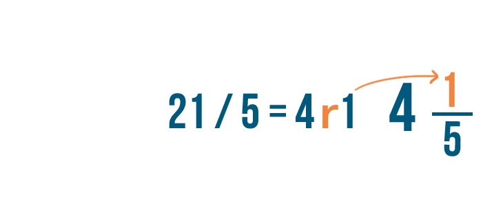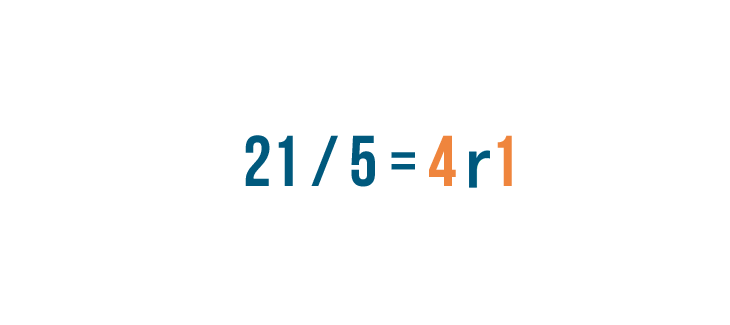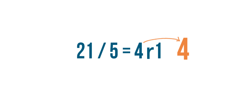 As you learned in the previous lesson, divide the top number by the bottom number. 21 divided by 5 equals 4, with a remainder of 1.