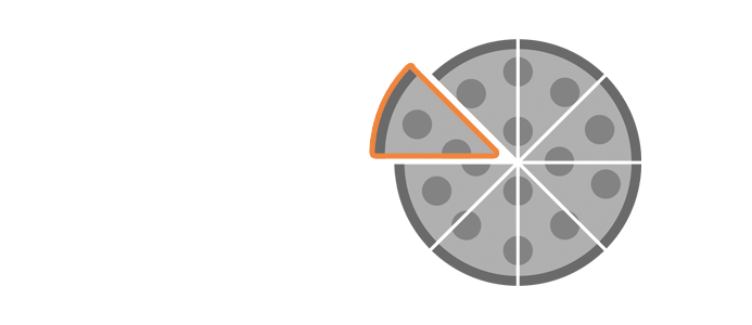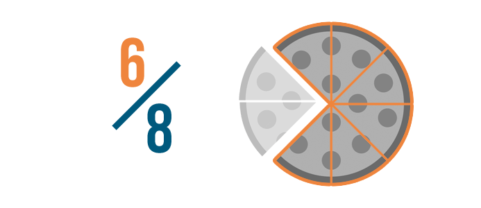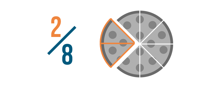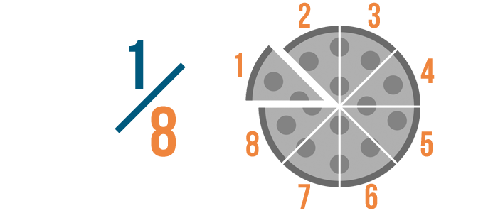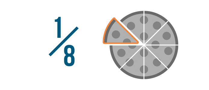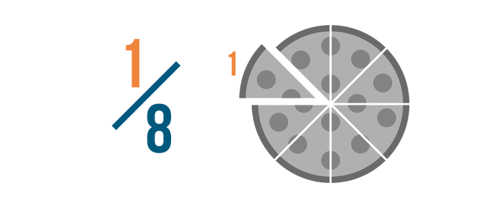 In the example above, if you had a pizza with eight slices, each slice would be 1/8 of the pizza. You'd read that like this: one-eighth.