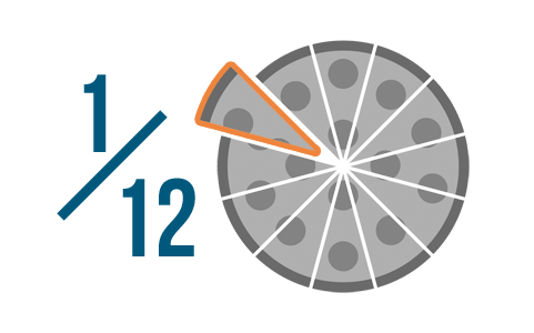 Let's look at another example. What if we divided the same pizza into 12 slices instead of 8? If we took one slice, that would be 1/12 of the pizza—1 slice out of the 12 total slices. No matter what fraction you're trying to write, you always write it the same way—with the number of parts on the bottom, and the parts you're referring to on top.