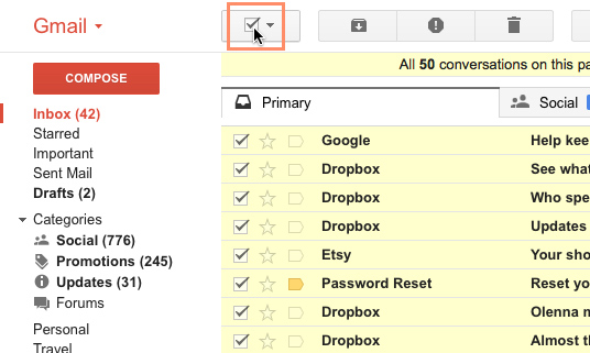 Let's say you have a large number of emails you'd like to delete. It would be fairly time consuming to go through and individually delete each email. Luckily, most clients have a feature that allows you to select multiple emails. These are usually in the form of check boxes next to each of your emails. Many clients also have a Select All button, which will select every email on the page, as seen below.
